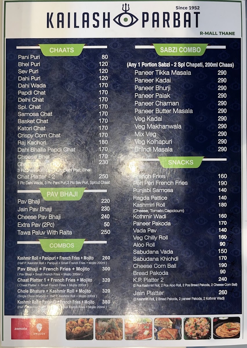 Welcome to Kailash Parbat - Thane, a vibrant dining gem nestled in the Viviana Mall food court. This establishment is a haven for veg food lovers, renowned for its authentic Indian chaat and diverse street food offerings. With a menu boasting over 100 items, the options are plentiful. From the flavorful Chole Bhature to a delightful Biryani Combo, each dish is crafted with precision and care. The Chaat Platter, featuring classics like Sevpuri and Dahi Puri, is a must-try for those seeking a burst of flavors.